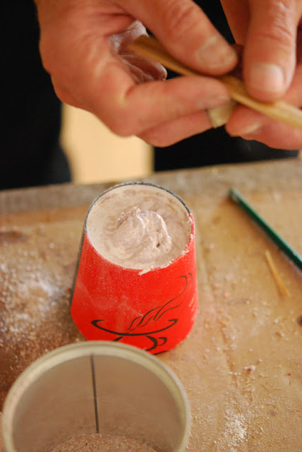 When repairing the holes in the Chief's Crest Pole, Andrew uses two different types of fillers. The one above is an epoxy based filler. The epoxy is used in areas that carry a big load and require a great deal of strength.